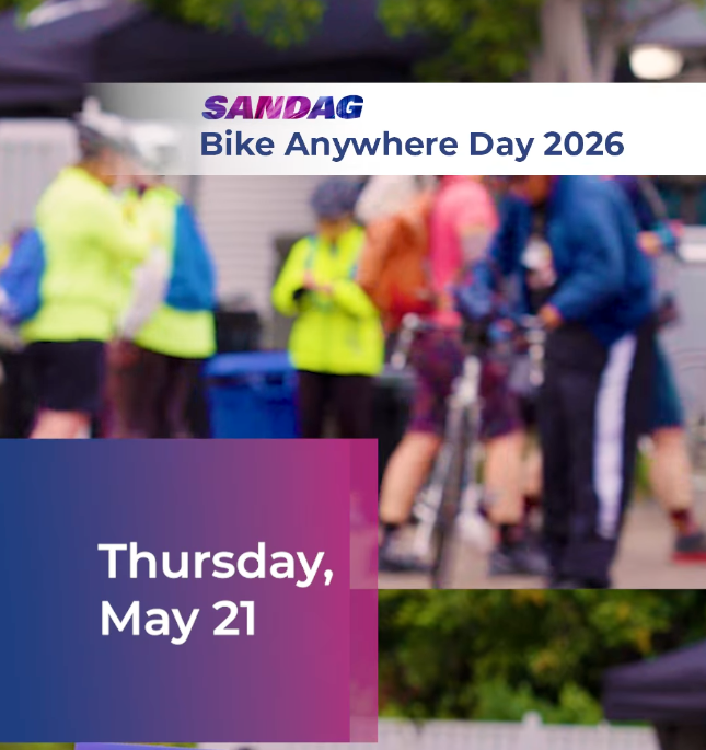 Bike Anywhere Day 20266:00 AMCity Wide Day of Biking AroundSANDAG @sandagregionBike Anywhere Day (formerly Bike to Work Day) is a free, annual event that SANDAG has hosted in the San Diego region for more than 30 years. It is an opportunity for everyone to bike to work, school, the beach, or anywhere.