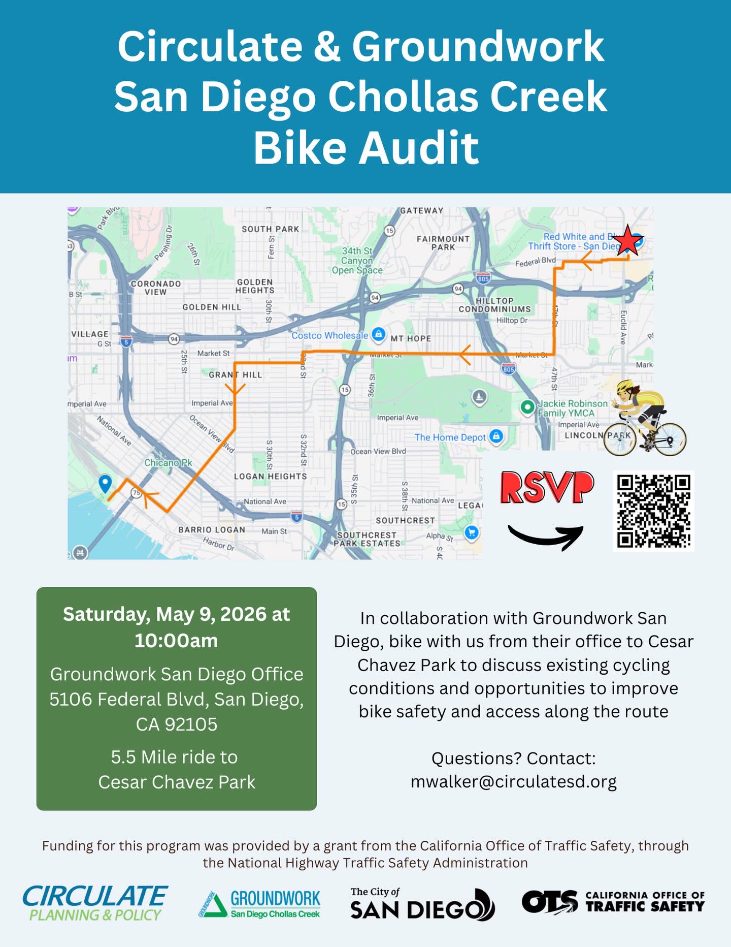 Bike Audit10:00 AMGroup RideCirculate SD @circulatesdJoin us on Saturday, May 9th at 10:00am for a 5.5 mile Bike Audit from Groundwork San Diego’s office to Cesar Chavez Park! In collaboration, ride with us to discuss existing cycling conditions and opportunities to improve bike safety and access along the route.Groundwork Coffee San Diego OfficeCesar Chavez Park5.5 miles