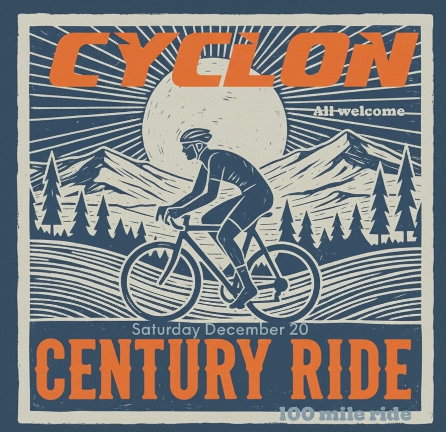 Cyclon Century Ride7:00 AMGroup RideCyclon Cycling Squad @cyclon_cycling_squadThe end of the year is coming, and we will be taking a few weeks off (vacation) until further notice.
