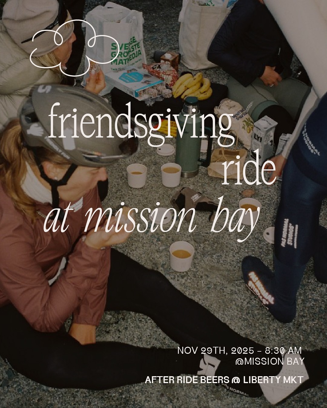 Friendsgiving Ride Mission Bay Ride8:30 AMGroup RideWomen on the Road @wmn.ontheroadFriendsgiving Ride for November! Because real gratitude is being able to spend a Saturday morning riding with your friends. We roll out from Mission Bay at 8:30 and make a mid-ride coffee stop at Queen Stage to refuel. See you there! 🚴♀️🧡