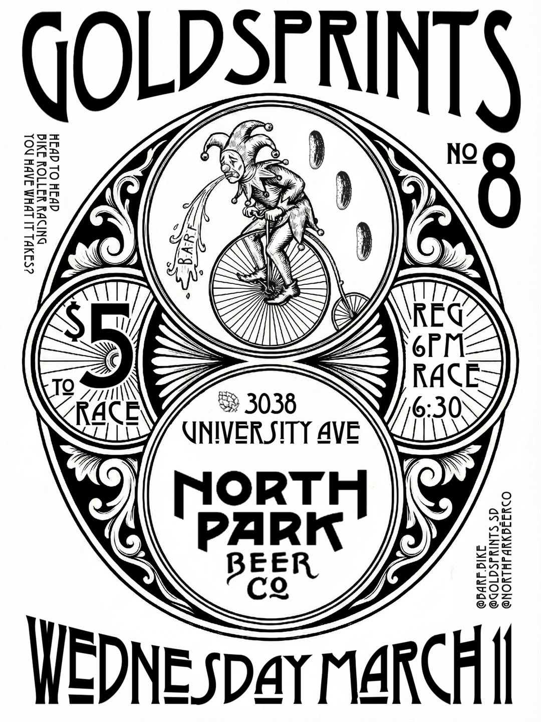 Goldsprints 86:00 PMRace (Unofficial)GoldSprints @goldsprints_sdGOLDSPRINTS IS BACK! Join us on Wednesday March 11th for another evening of chaos, bikes, fun and friends. This time we’ll be at @northparkbeerco in their enormous loft, with food provided by the wonderful @mastiffkitchen_northpark . This will be our 8th GoldSprints and we’ve had the chance to make some upgrades, and we’re so stoked to bring back the chaos wheel with some fun new additions. Registration will open around 6pm, so come early and pre-game with us, it’s going to be a riot!North Park Beer CoDetails on IG.