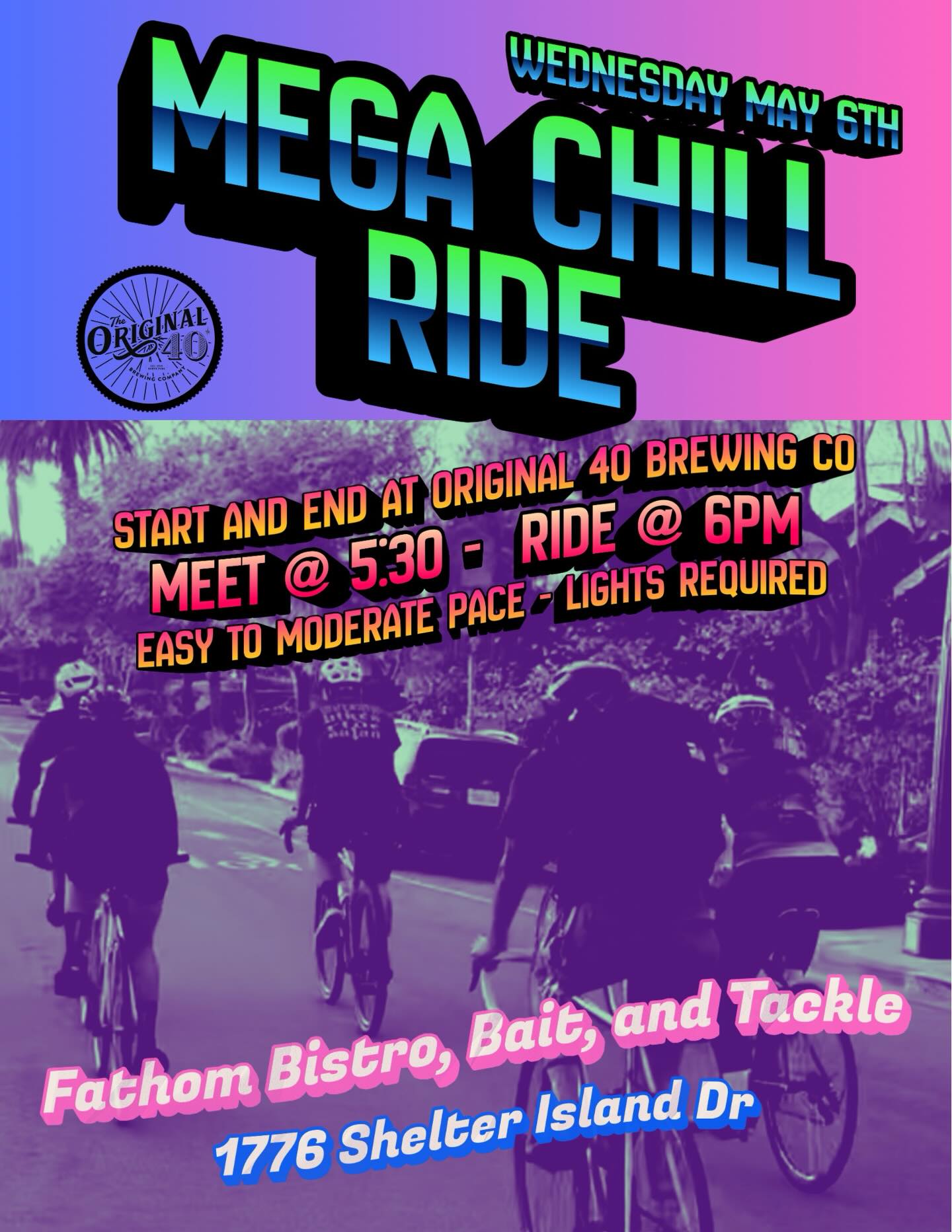 Mega Chill Ride5:30 PMGroup RideOG 40 Cycling @og40cyclingMay’s Mega Chill Ride Wed 5/6 is taking us to @fathombistro on Shelter Island! Meet 5:30 @original40beer roll at 6:00! Remember to bring a jacket and lights! See ya then!Original 40 Brewing CompanyDetails on IG
