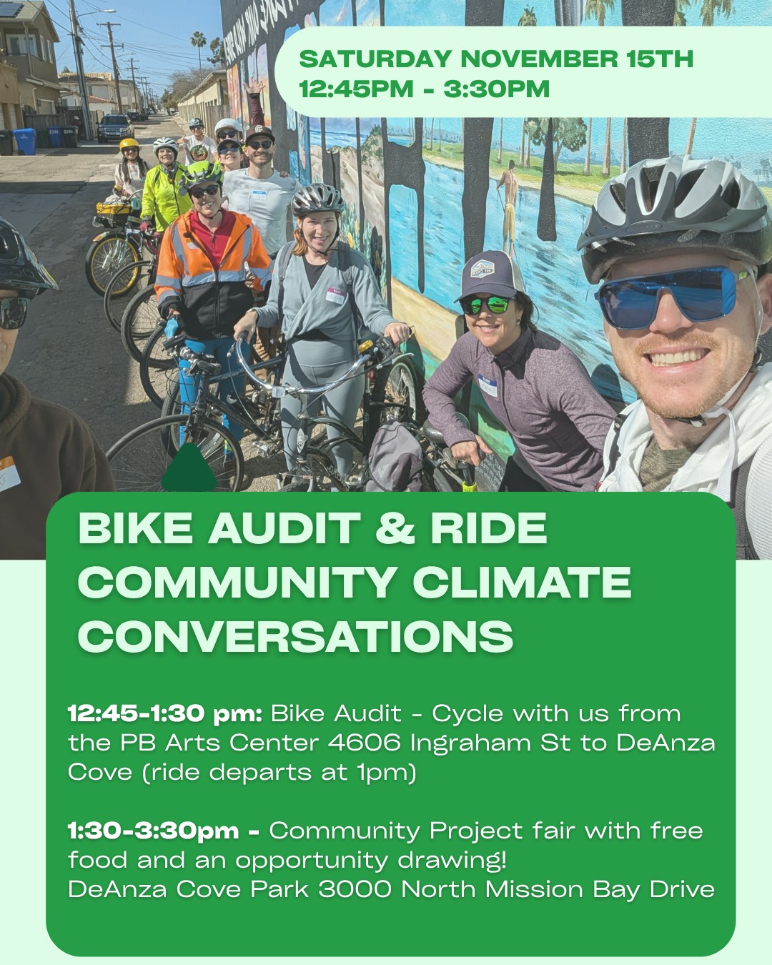 Community Climate Conversation12:45 PMGroup Ride / Bike AuditBeautiful Pacific Beach @beautifulpacificbeach🚴💬 Join us for a Community Climate Conversation & Bike Ride!