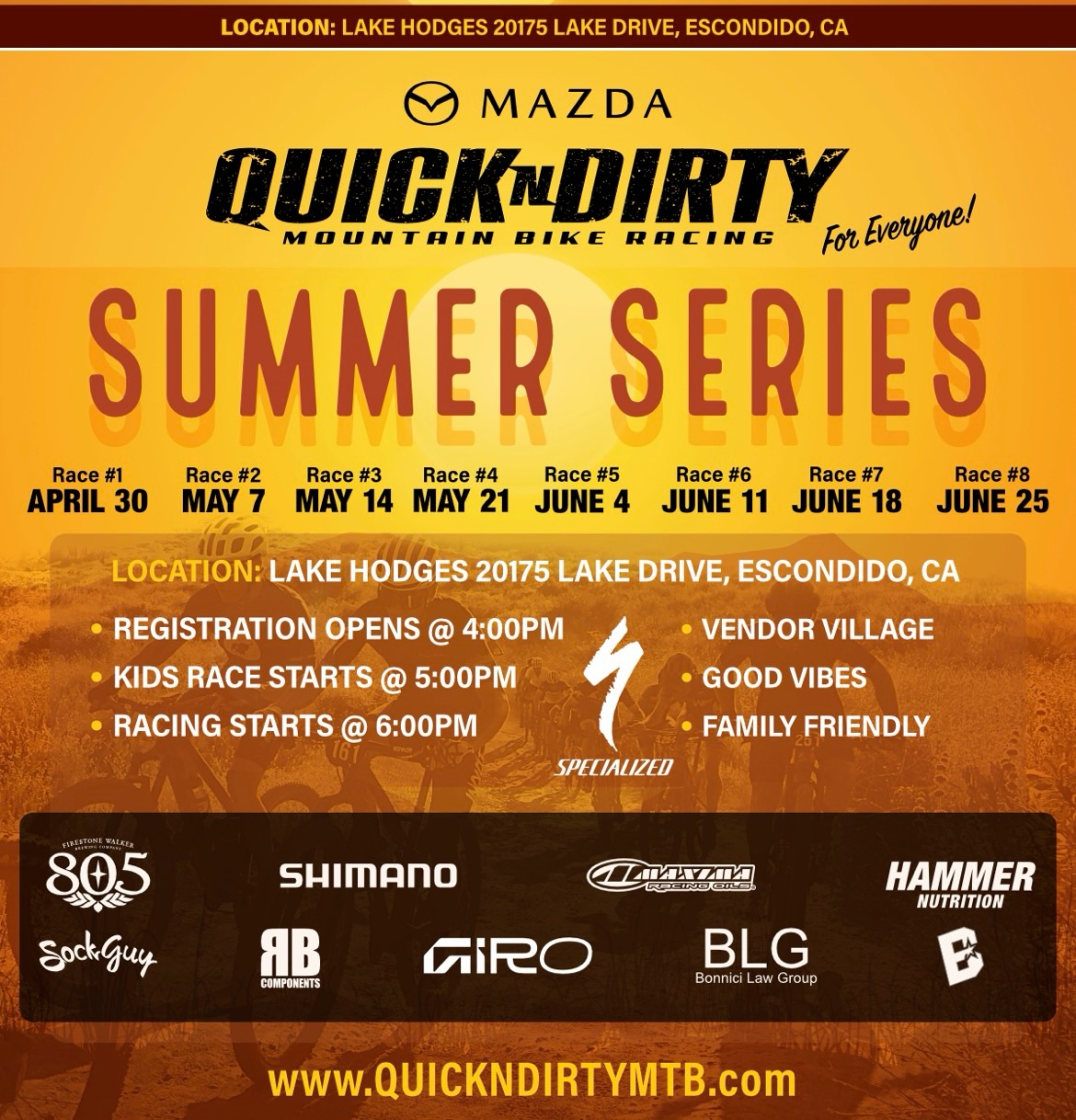 Quick N Dirty Summer Series5:00 PM (Race #1/8)Race (Official)Quick'N'Dirty @quickndirtymtbThe Summer Series is where it all started and to this day continues to be the staple of the Quick n’ Dirty vibe. You can expect a fun, fast, and challenging series of races that keeps you tuned up, doesn’t break your wallet, and in most cases, gets you home in time for dinner. However, we will have food vendors on site if you want to kick back, relax, and grab a bite to eat at the race.Lake Hodges Boat RampDetails & Registraion on the website