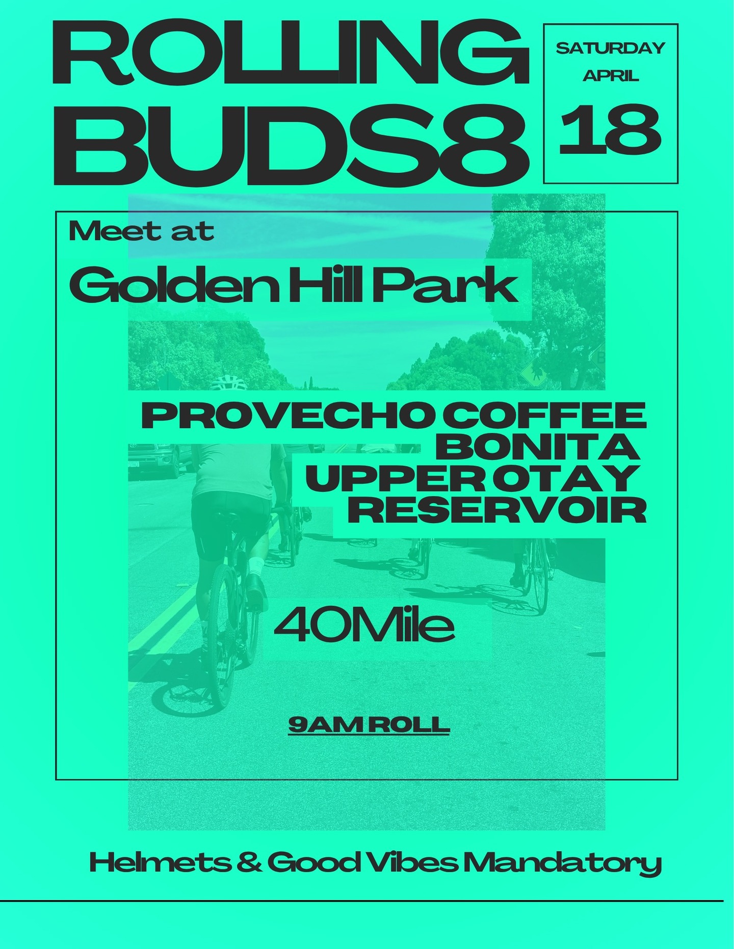 Rolling Buds 89:00 AMGroup RideRolling Buds @rolling.budsHere we go! RB8! This time we're meeting up at Golden Hill Park! We'll drop down to Provecho in Barrio Logan to fuel up with a Coffee before we roll over to Bonita. Getting into Eastlake, be ready for some climbs! 9AM ROLL.Golden Hill Park40 milesDetails on IG.