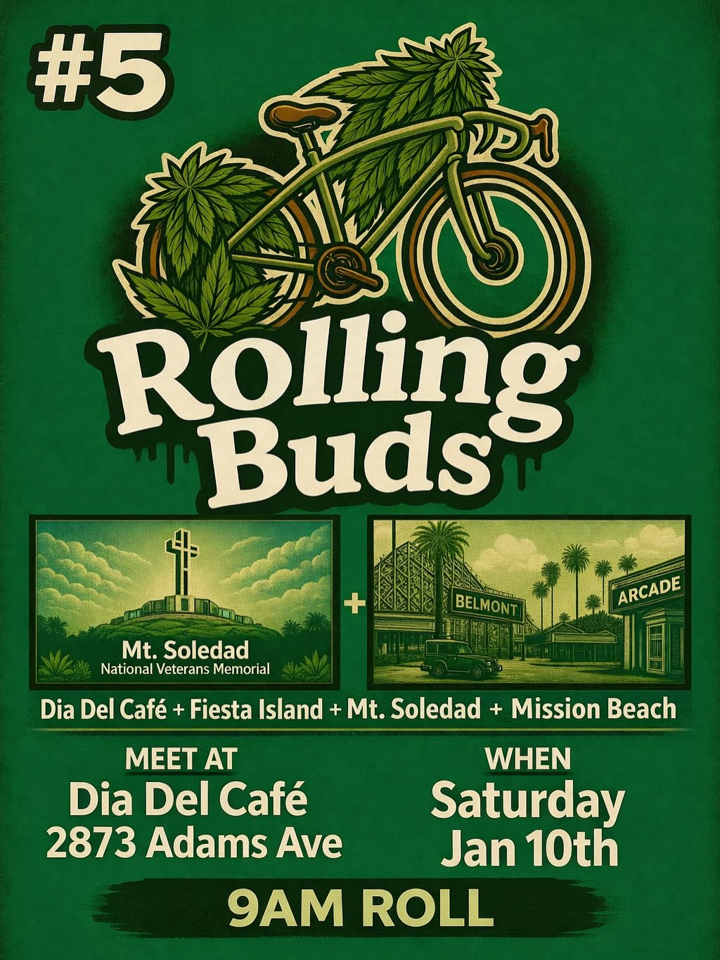 This time, we’re meeting at DIA DEL CAFÉ on Adams Ave where we’ll enjoy a Coffee , Pastry & Spliff 💨 before venturing down to Fiesta Island for 1 lap! After Fiesta, we’ll roll our way up to Mt. Soledad for a little climb! From Soledad , we’ll work our way down to Belmont Park/Mission Beach to get some Food/Chill/Spliffs 💨 before looping back to Dia Del Café.