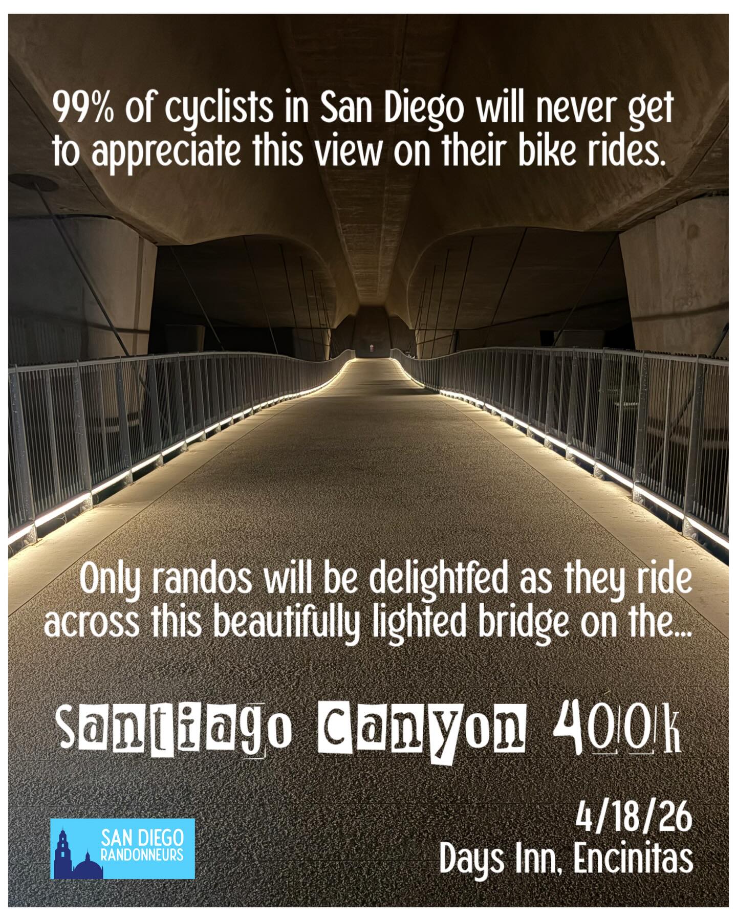 Santiago Canyon 400k6:00 AMGroup RideSD Randonneurs @sd_randonneursThe Santiago Canyon 400k brevet is a scientific endeavor to create a flattish 400k flattish route in starting and finishing in San Diego County that: