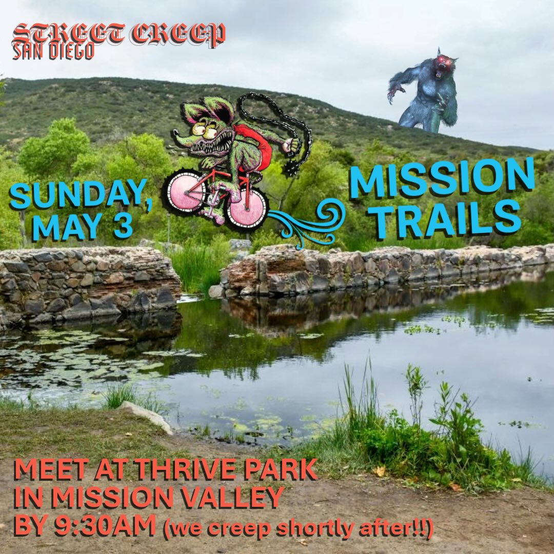 Mission Trails9:30 AMGroup RideStreet Creep San Diego @streetcreepsandiegoYo, let’s creep out this Sunday to Mission Trails. Meet us at Thrive Park (near playgrounds) in Mission Valley at Snapdragon Stadium by 9:30AM. We will roll up Friars to Mission Gorge and pop through Mission Trails. Come out on the 52 Bike Ln. up to Tierrasanta, head up to Kearny Mesa back down Murphy Canyon Road to Mission Valley. Yes there are hills. Let me know if you have any questions. Sorry also to clarify we’re not doing any off-road dirt trails. We’re gonna go through the paved road that runs from Mission Gorge by the visitor center all the way to the end past theThrive ParkDetails on IG
