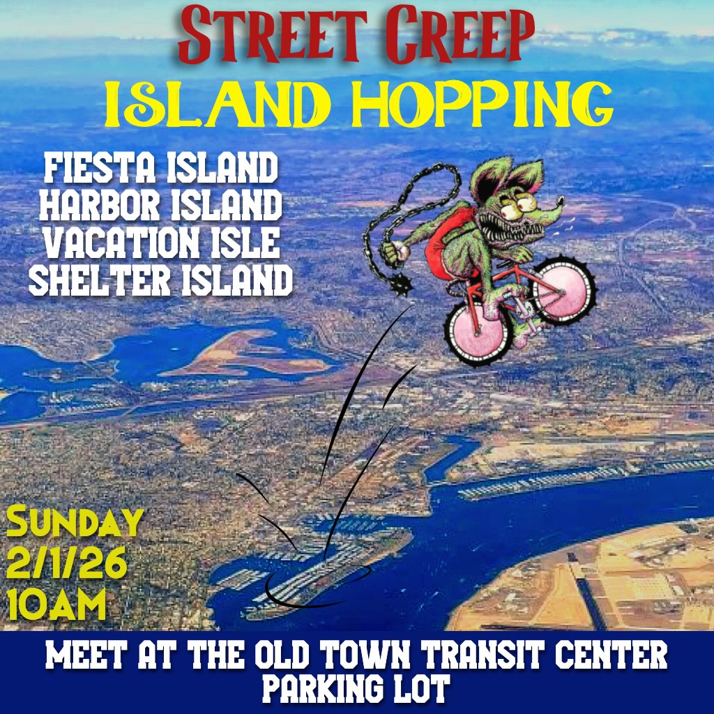 Island Hopping10:00 AMGroup RideStreet Creep San Diego @streetcreepsandiegoWe are doing our local island hopping creep on Sunday (conceived and co-led by @djaz_kook )! We’ll meet at the Old Town Transit Center parking lot at 10AM then head to Fiesta Island, followed by Vacation Isle, then Shelter Island plus a coffee break, and finally we will circumnavigate Harbor Island before heading back to our starting point.