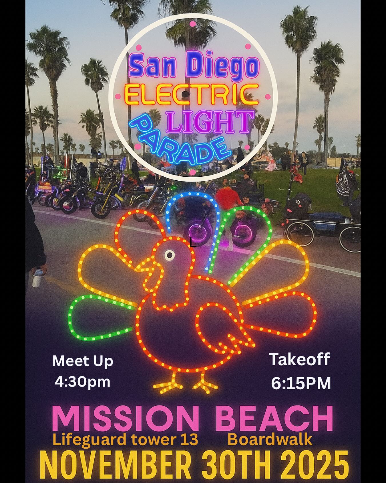 San Diego Electric Ligiht Parade4:30 PM (Monthly)Group RideSan Diego Electric Light Parade @sandiegoelectriclightparadeMake your plans to to ride with the SD electric bicycle light parade after all the Thanksgiving eating this is the time to get some fitness going. See y’all in San Diego.Tower 13Details on IG.