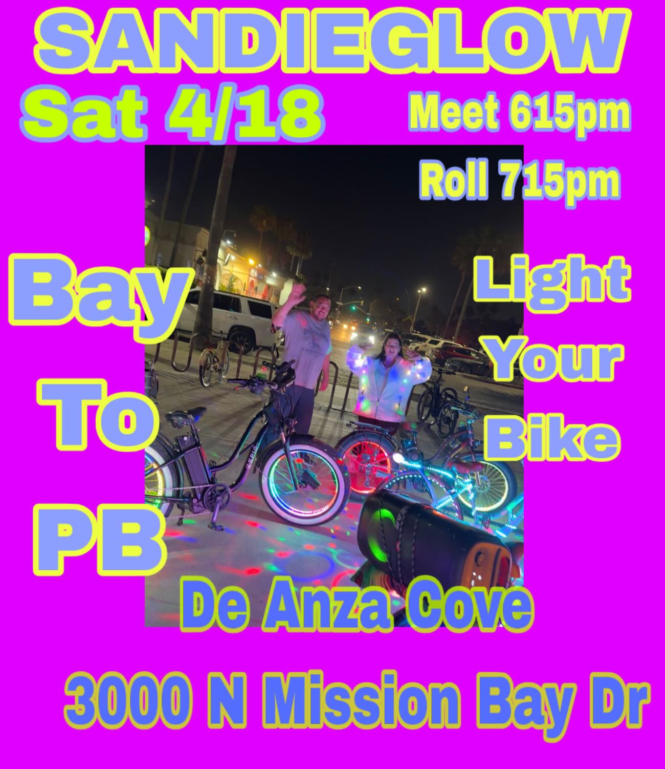 Sandieglow6:15 PMGroup RideSandieglow @sandieglowCome ride with us. Fun times with good people. A cruise at the coast. All are welcomeDe Anza Cove ParkDetails on IG.