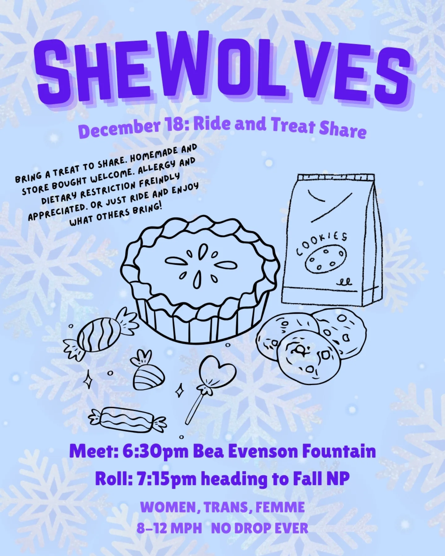 SheWolves!6:30 PM (Third Thursdays)Group RideSheWolves @sd_shewolvesHappy Holidays SheWolves! We are forgoing the annual gift exchange for a wallet friendly treat exchange. Ride with us on December 18 and bring a treat to share with the group. It could be cookies, cakes, fruit, your favorite protein bar (?!), anything you'd love to share. But sharing is not required. We'd love to just have you along for the ride to close out another year of SheWolves. 💜🖤💜🖤Bea Evenson Fountain~10-15 milesFollow along on IG for details.