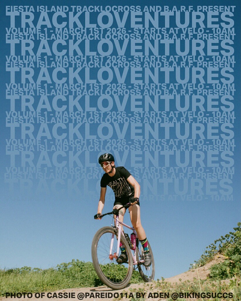 Trackloventures10:00 AMGroup RideB.A.R.F. @barf.bikeIn addition to our rotating race series between Morley field and Fiesta Island we’re adding a quarterly trackloventure ride. We will be starting at the velodrome at 1000 and will mosey our way through Tecolote Canyon, Marian Bear open space, and Rose Canyon. Any bike is welcome!San Diego VelodromeDetails on IG.