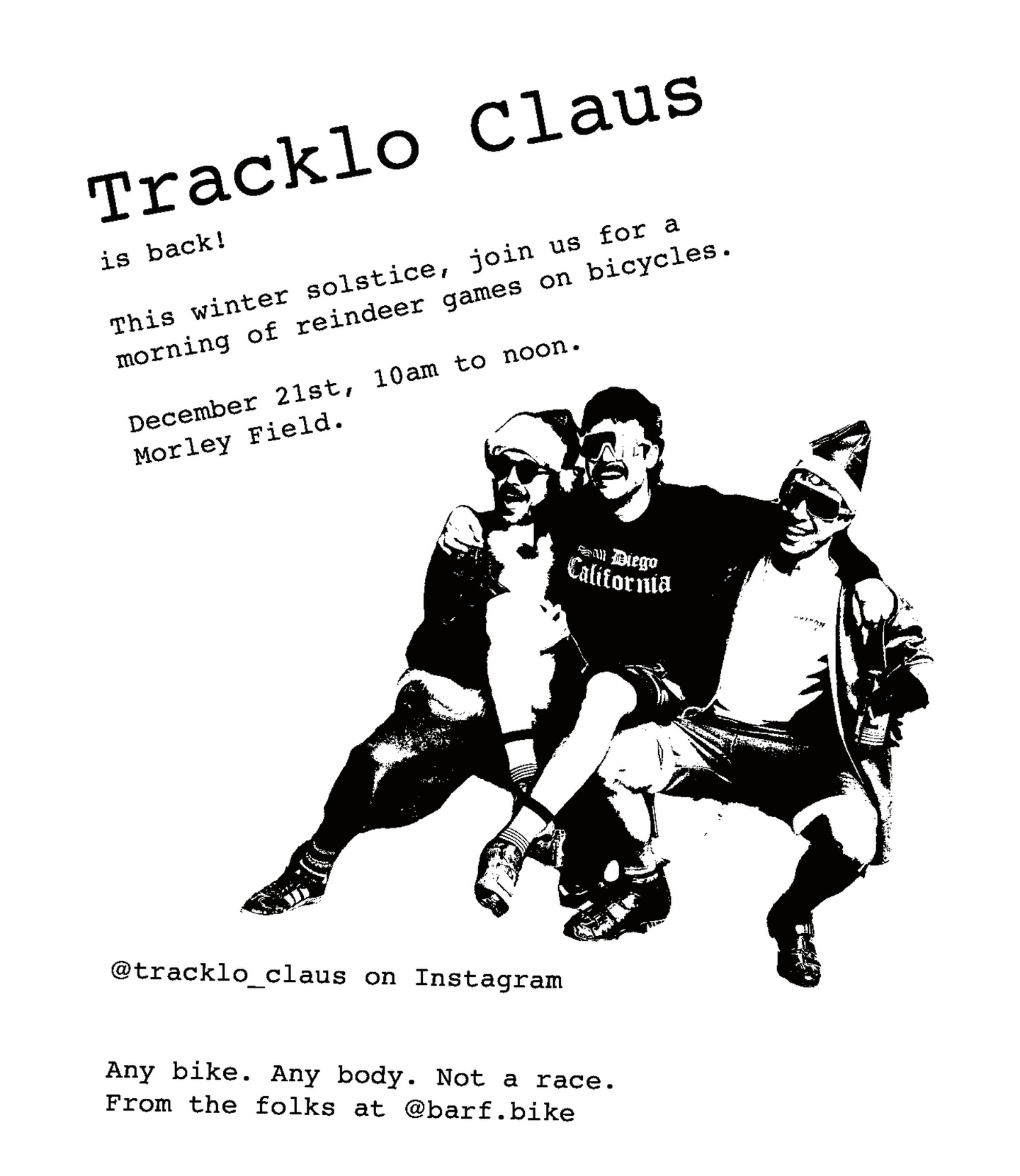 Tracklo Claus Too10:00 AMParty RaceTracklo Claus @tracklo_clausTracklo Claus Too: Reindeer Games on Bicycles.