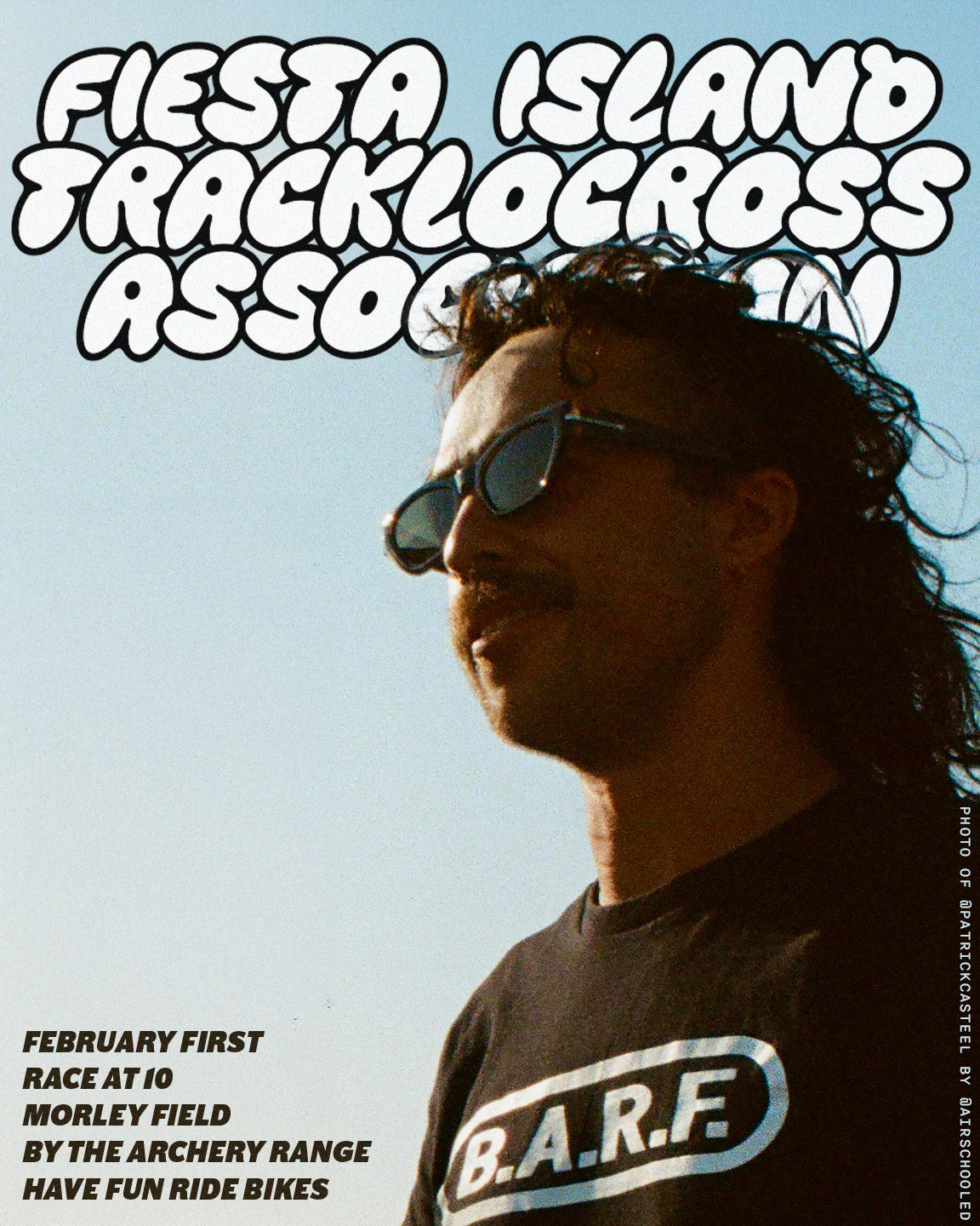 Morley Island Tracklocross10:00 AM (First Sundays)Race (Unofficial)Fiesta Island Tracklocross Association @fiestaislandcxWe will be racing in the dirt at Morley on 2/1 at 10 in the morning. Any bike will do, no body will win any prizes.