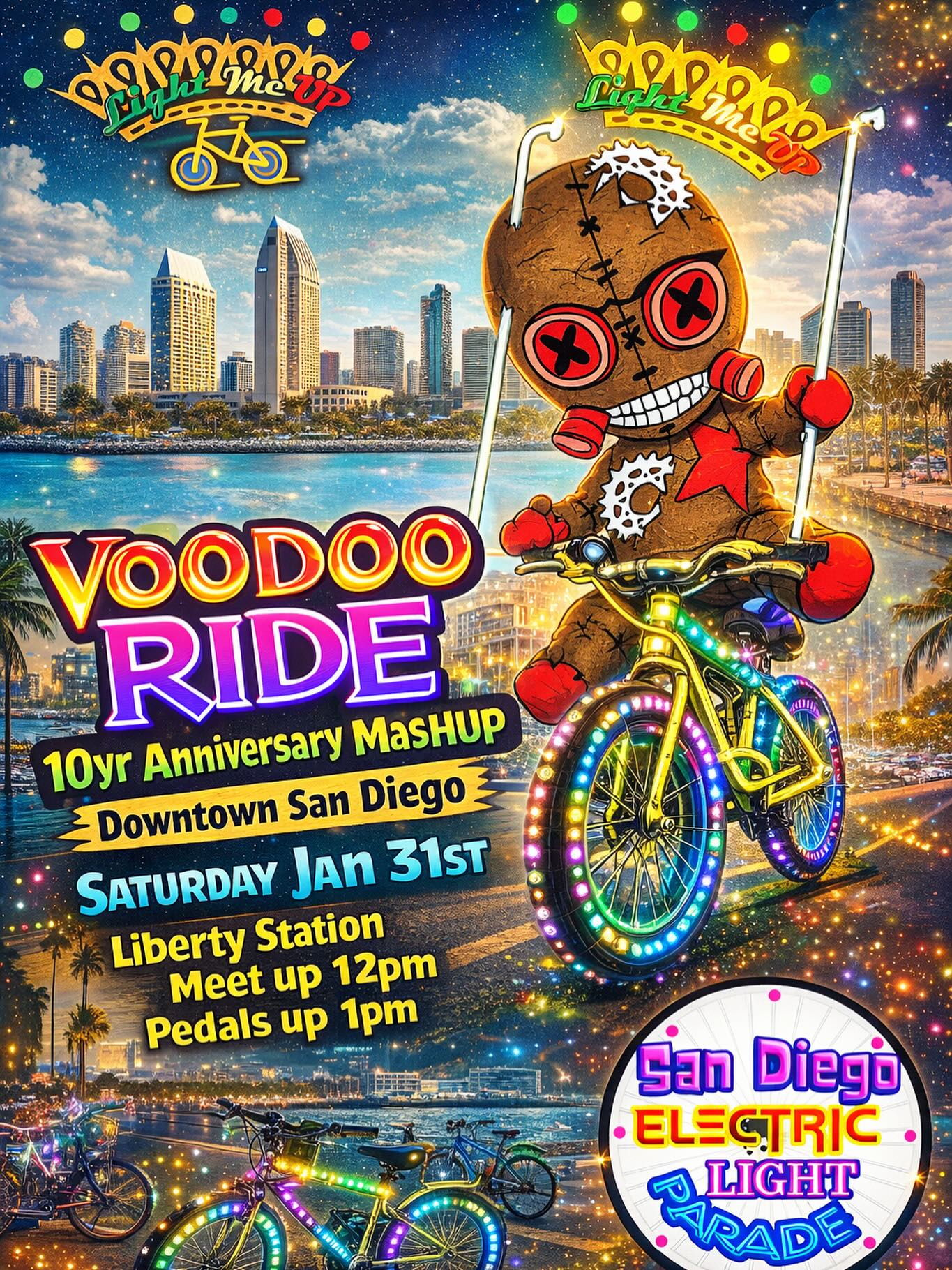 Voodoo Ride12:00 PMGroup RideSan Diego Electric Bike Parade @sandiegoelectriclightparade@voodoo_bike_rides 10yr Anniversary of bringing people together on bicycles.