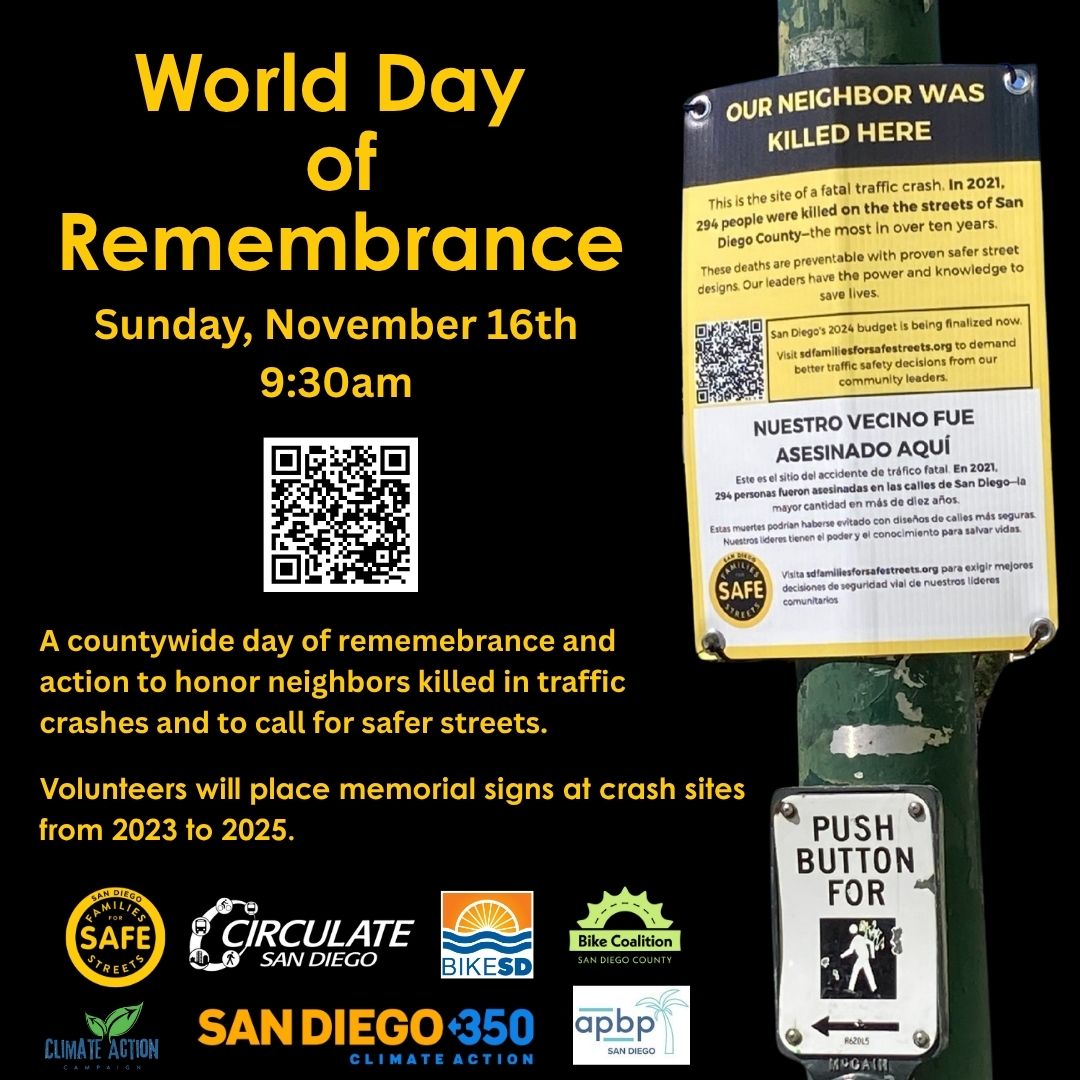 World Day of Rememberance9:30 PMFamilies for Safe Streets SD @familiesforsafestreetssdOn November 16, join Families for Safe Streets San Diego, safe street advocates and community members for World Day of Remembrance for Road Traffic Victims—a day to honor over 540 people killed in preventable crashes on our streets since 2023.