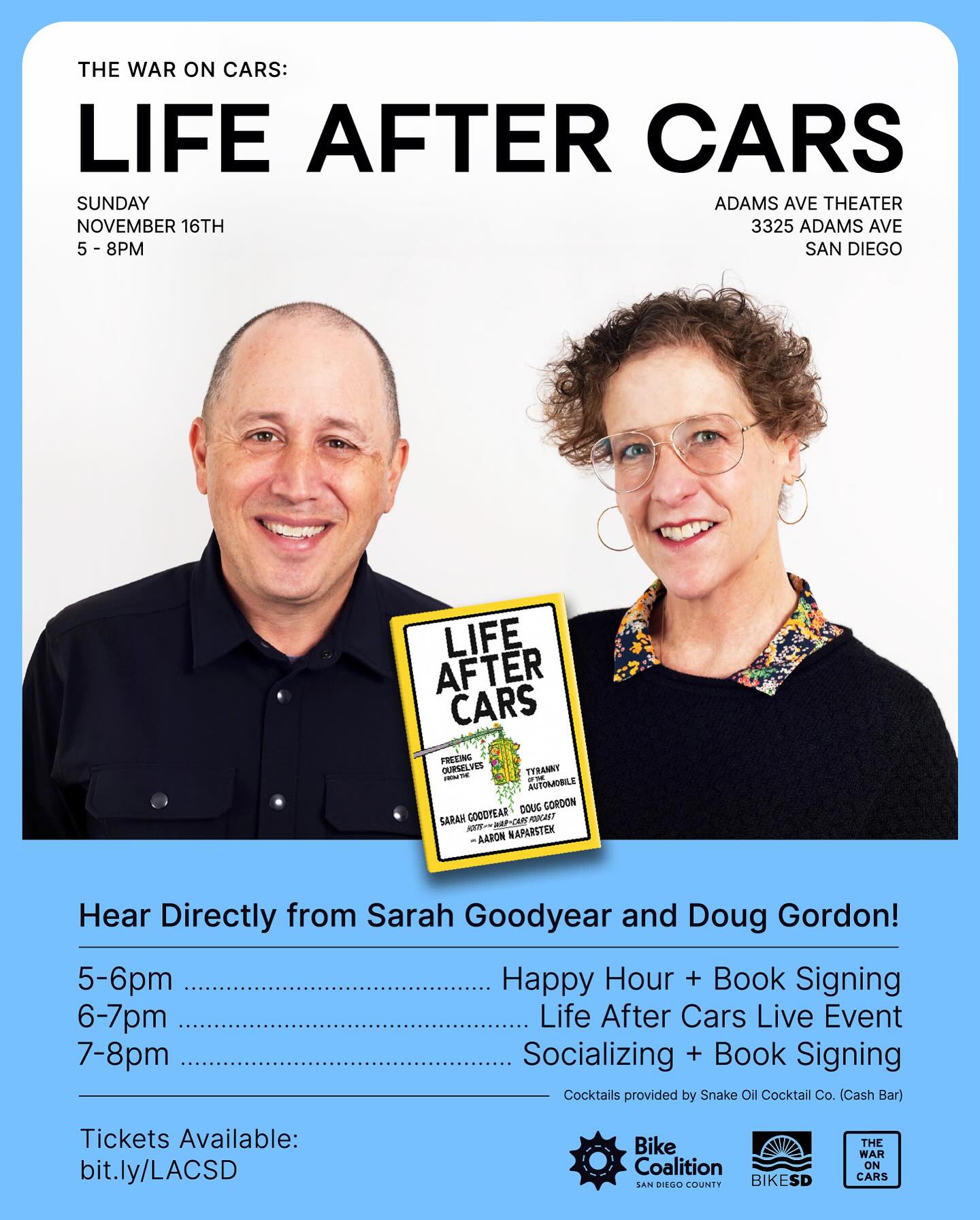 The War on Cars will be at the Adams Avenue Theater on November 16th to discuss their new book, Life After Cars.