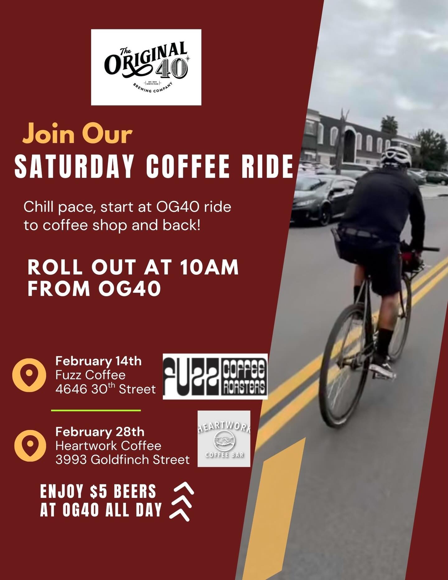 $5 beers all day every Sat back at OG40!Heartwork CoffeeDetails on IG.