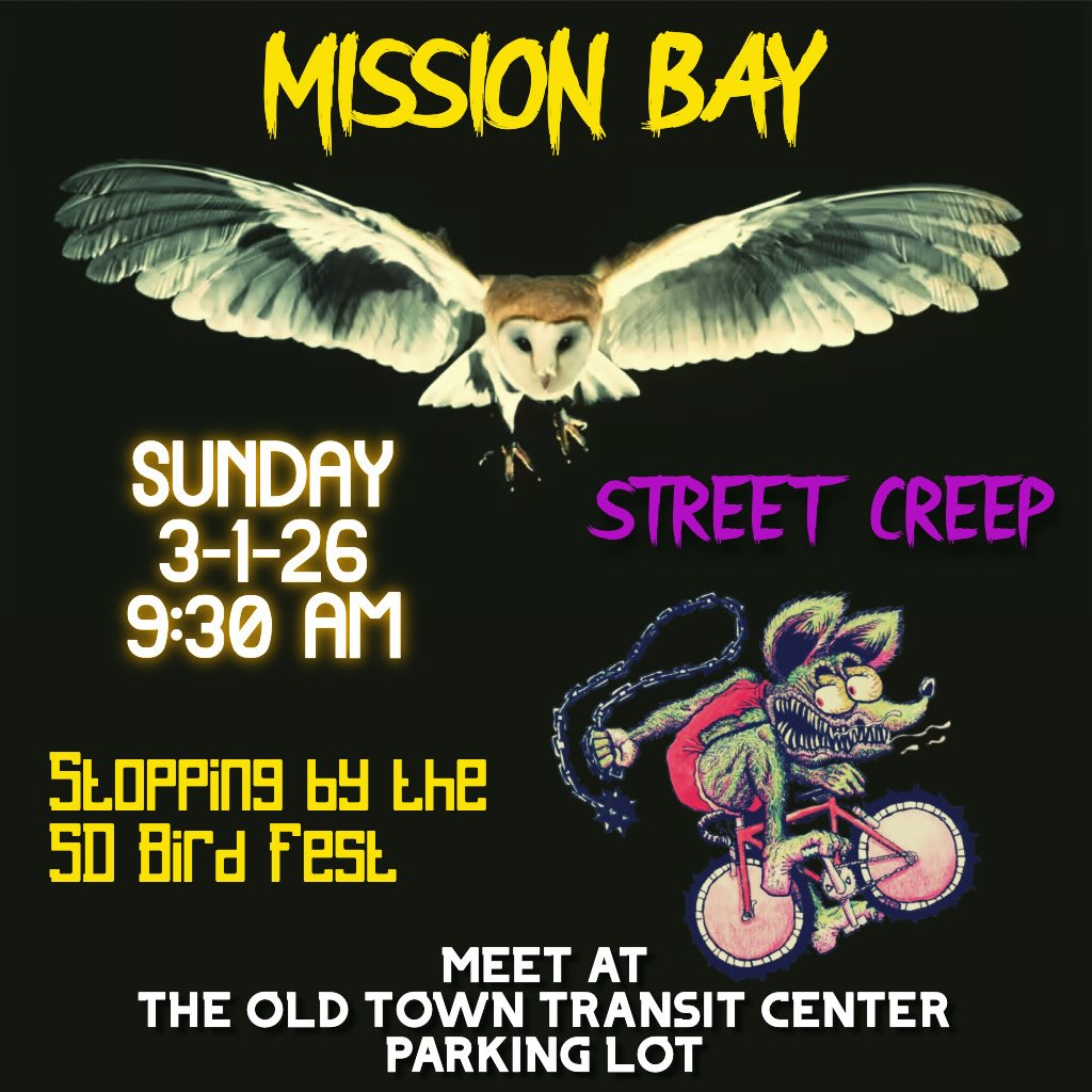 Mission Bay Street Creep9:30 AMGroup RideStreet Creep San Diego @streetcreepsandiegoTime for another chill creep around Mission Bay this Sunday, March 1. Meet up at OTTC by 9:30AM. All levels, no drop ride. Super flat. And we’re going to roll by the San Diego Bird Festival in Marina Village. 🦜🦆🦅Old Town Transit Park and RideRSVP on Strava