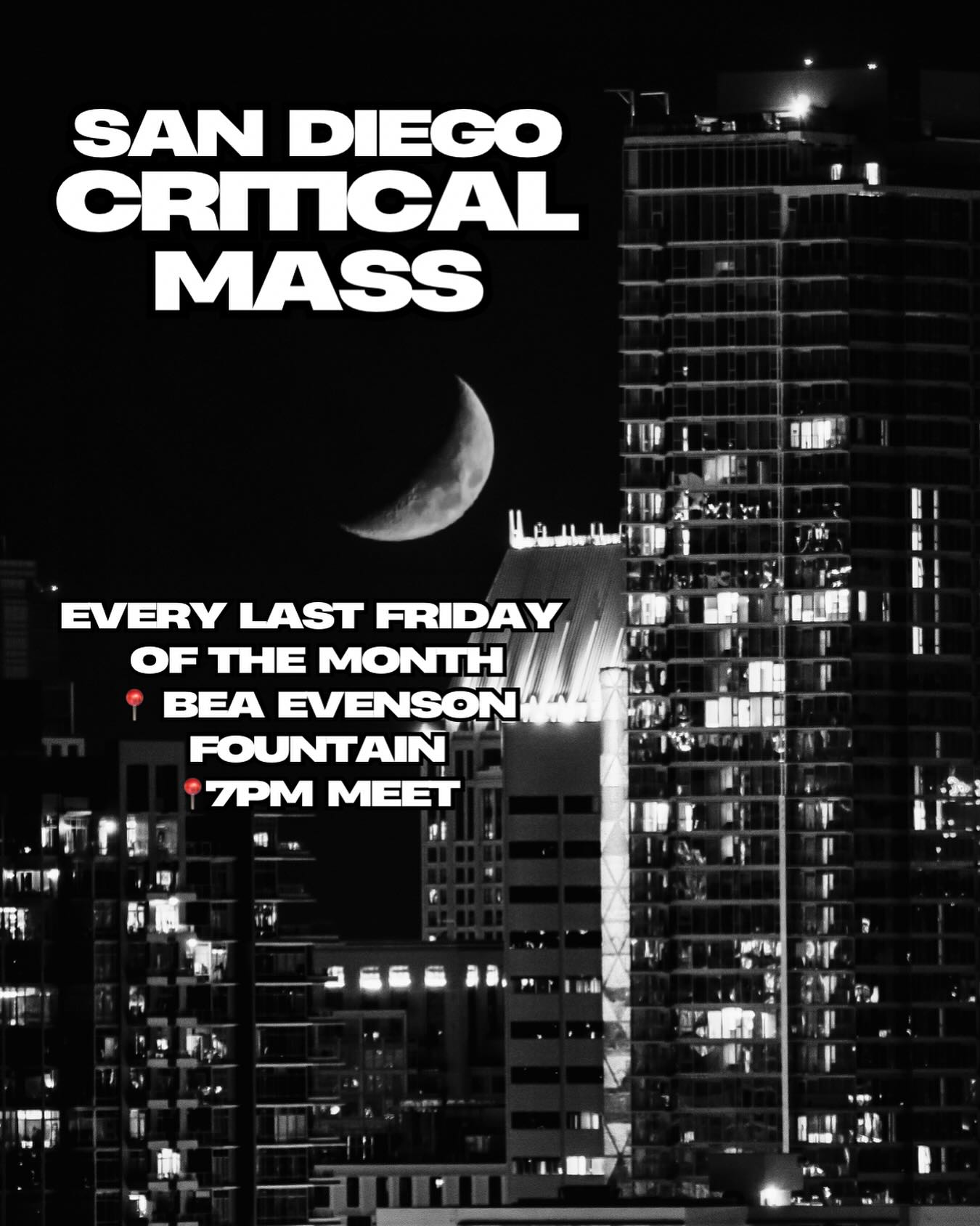 Critical Mass San Diego7:00 PM (Last Fridays)Group RideSD Critical Mass @sd.criticalmassEvery Last Friday of the Month •📍Balboa Park Bea Evenson Fountain Meet: 7pm Roll: 7:45Bea Evenson FountainFollow along on IG for details.