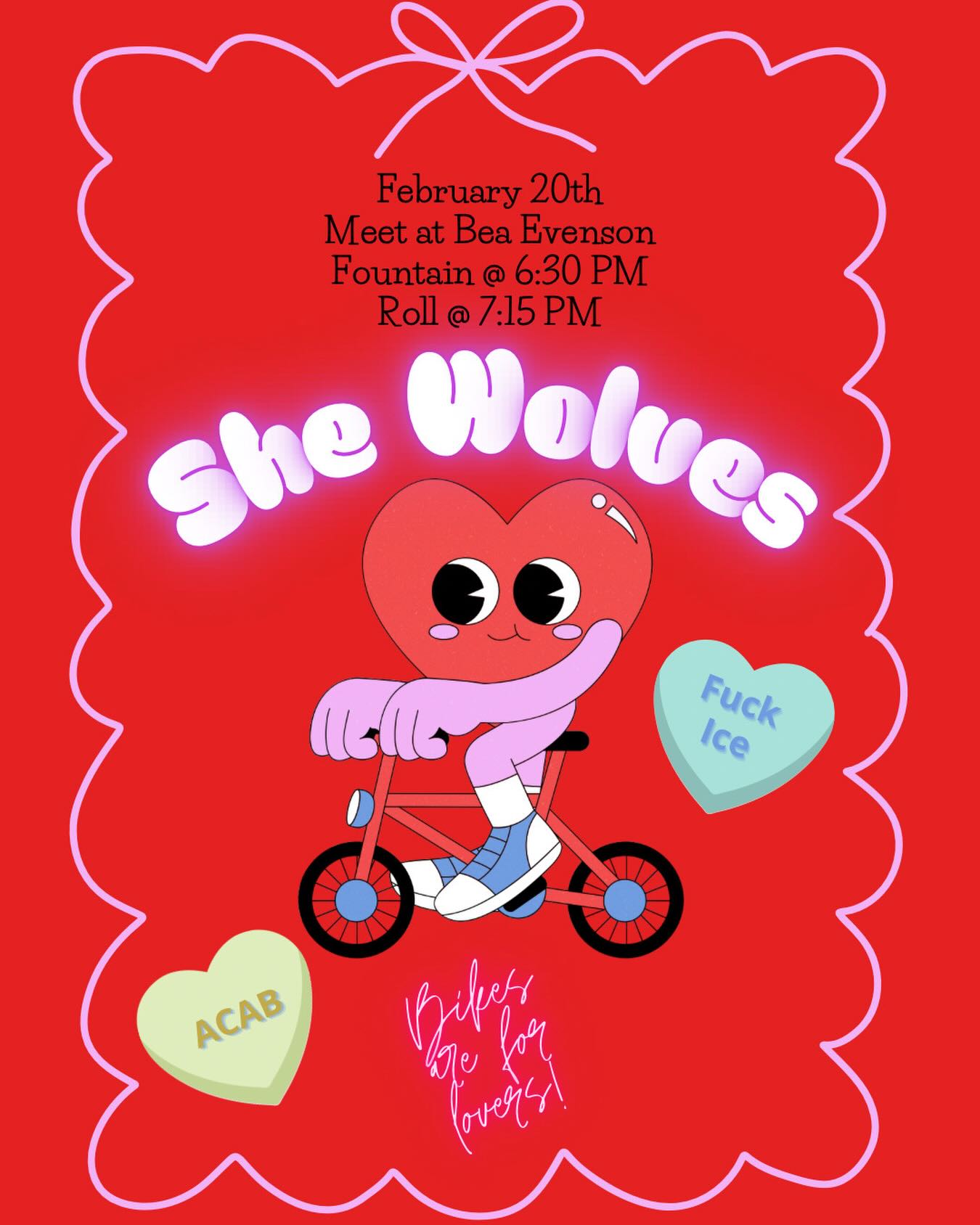 Galentine’s Ride8:00 AMGroup RideWomen on the Road @wmn.ontheroadGET READY FOR A GALENTINE’S RIDEEEE, LADIES ❣️⭐️🪩🍭🍺